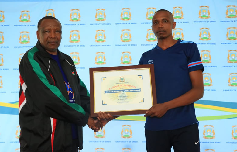 Mr Shadrack Kibet from the Department of Physical Sciences graduated with MSc Chemistry in September 2024. He won the Student Researcher of the Year 2024 for his thesis entitled